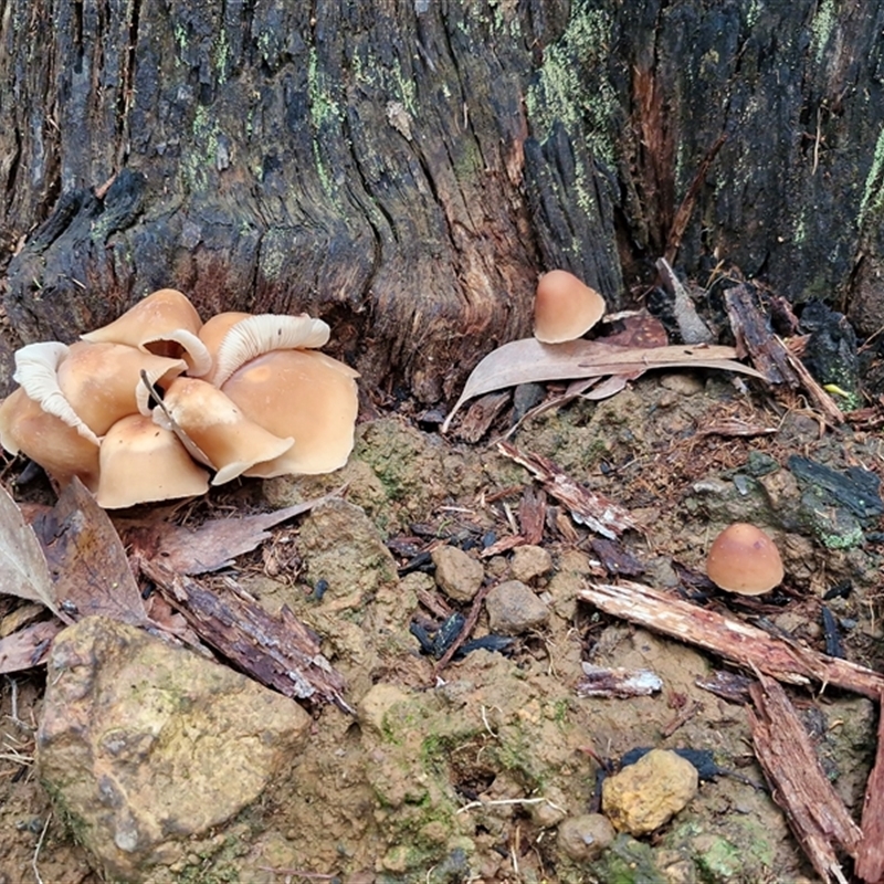 Growing in dense clusters, all stems arising from the same point: Armillaria, Flammulina, Gymnopilus, Hypholoma, Mycena.