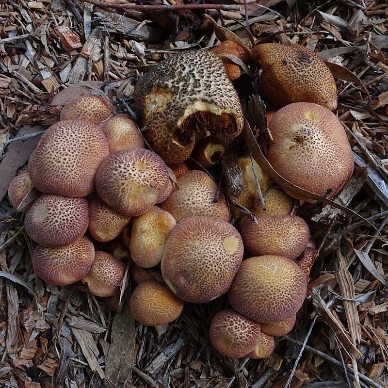 Growing in dense clusters, all stems arising from the same point: Armillaria, Flammulina, Gymnopilus, Hypholoma, Mycena.