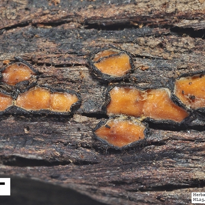 The fruit body is flattish and often more-or-less disk-like, but sometimes irregular in outline. The surface is orange and is surrounded by an erect, black rim that may be continuous (but uneven) or with say 2 or 3 breaks, thereby creating a few lobes.