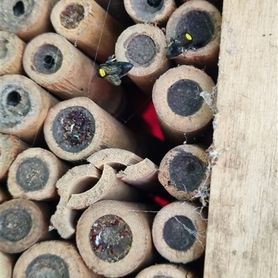 Male in flight, female on flower